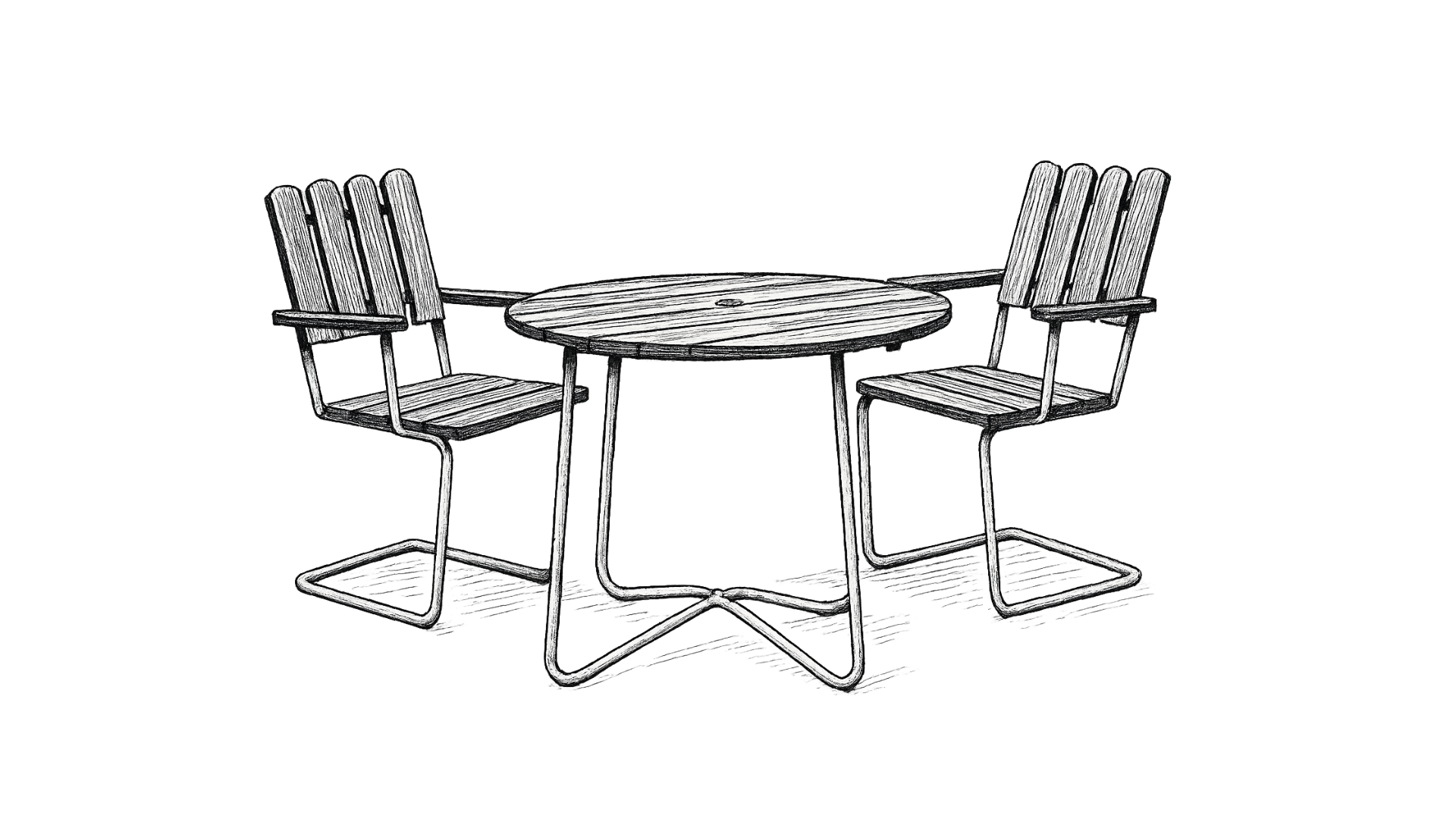 In the early 1930s, he designed a series of outdoor furniture that would become Swedish classics. The A2 armchair and the 9A table combine a simple steel frame with slatted wooden seats and backs, designed to be durable, comfortable, and suited for the outdoors. The spring in the steel frame gives the A2 its comfort, while the natural wood weathers beautifully over time.
