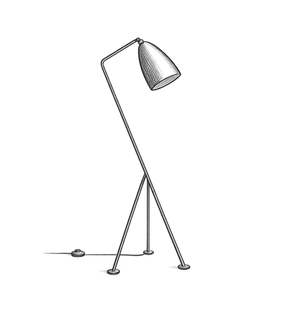 Designed in 1947 by Greta Magnusson-Grossman, the Grasshopper floor lamp (or Gräshoppa golvlampa in Swedish) is one of those pieces that catches your eye. Its slender, angled stand and elongated shade give it a light, sculptural feel that lives up to its name.